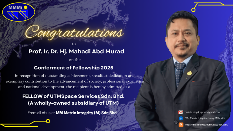 All of us at the MM Matrix Integrity (M) Sdn Bhd are truly proud of Prof.’s success in being admitted as a Fellow of UTMSpace Services Sdn. Bhd. (a wholly-owned subsidiary of Universiti Teknologi Malaysia).